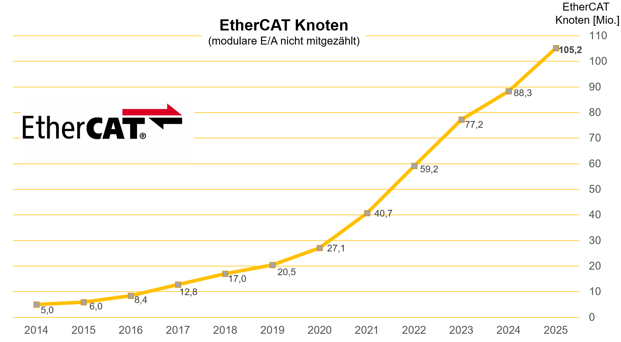Dank präziser Chip-Statistiken steht eine solide Datenbasis: Die ETG meldet für 2025 rund 105 Millionen EtherCAT-Knoten.
