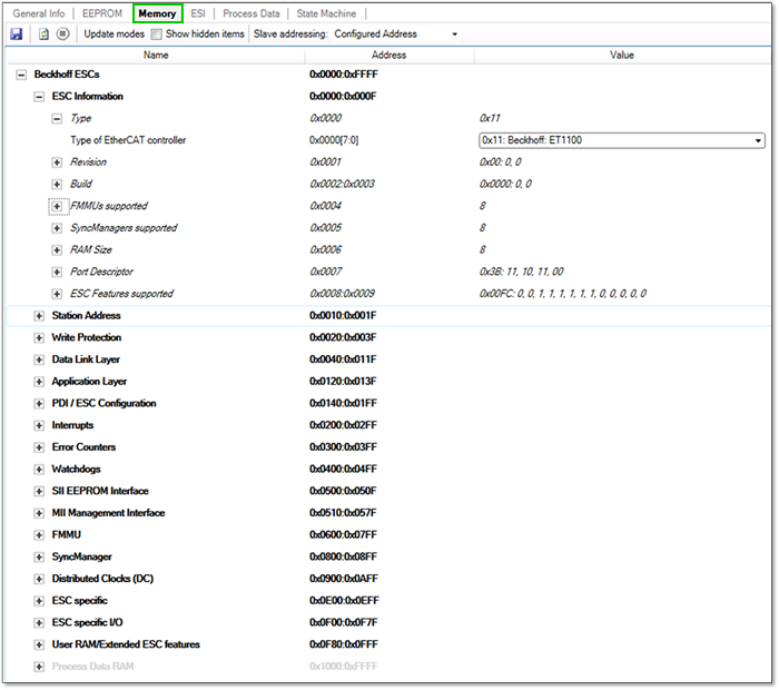 The ESC registers can be read from the slave and are shown in a well-readable and well-interpreted way.